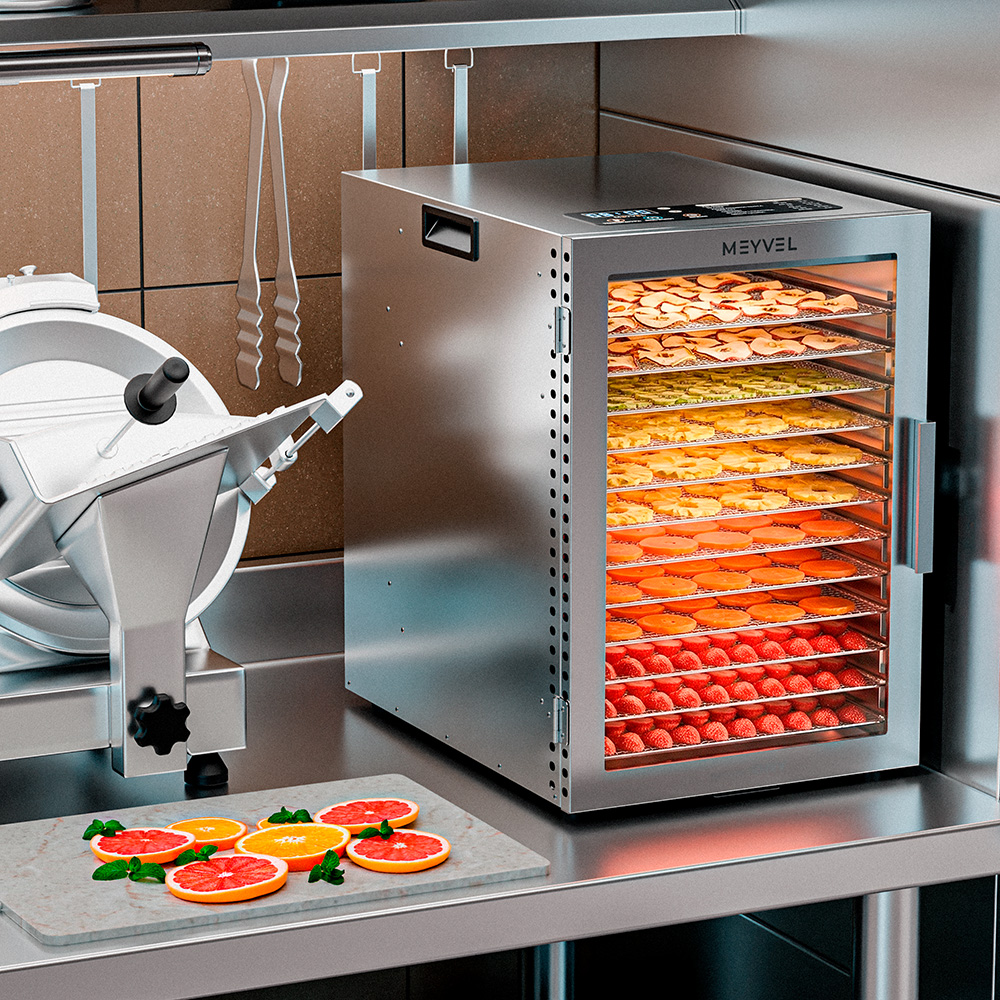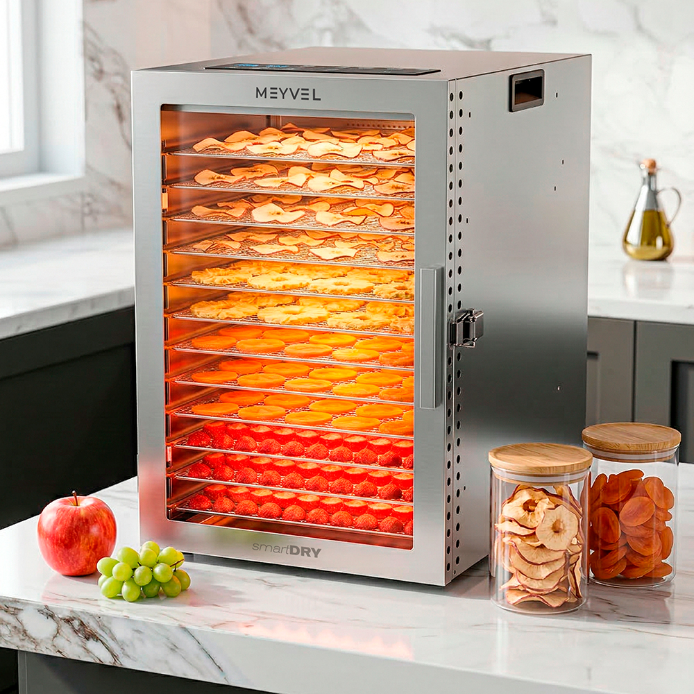 Meyvel MDH12-1S (Нержавеющая Сталь) (Inox) на 10 кг — это мощный дегидратор из нержавеющей стали для бережного высушивания продуктов без потери их вкуса, цвета и пользы. Он функционален, как профессиональная техника, и удобен, как простое домашнее устройство.