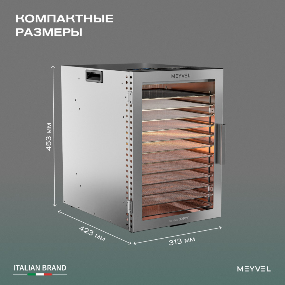Такое оснащение превращает Meyvel MDH12-1S (Нержавеющая Сталь) (Inox) в универсальный инструмент: он одинаково хорошо справляется и с сушкой зелени, и с приготовлением деликатесов.