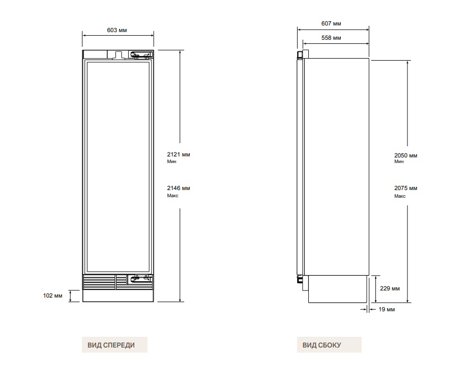В линейке приборов есть два размера – 75 и 60 см. В боковую стенку встроен диспенсер для воды. Внутренние части прибора выполнены из нержавеющей стали, стекла и АБС-пластика.